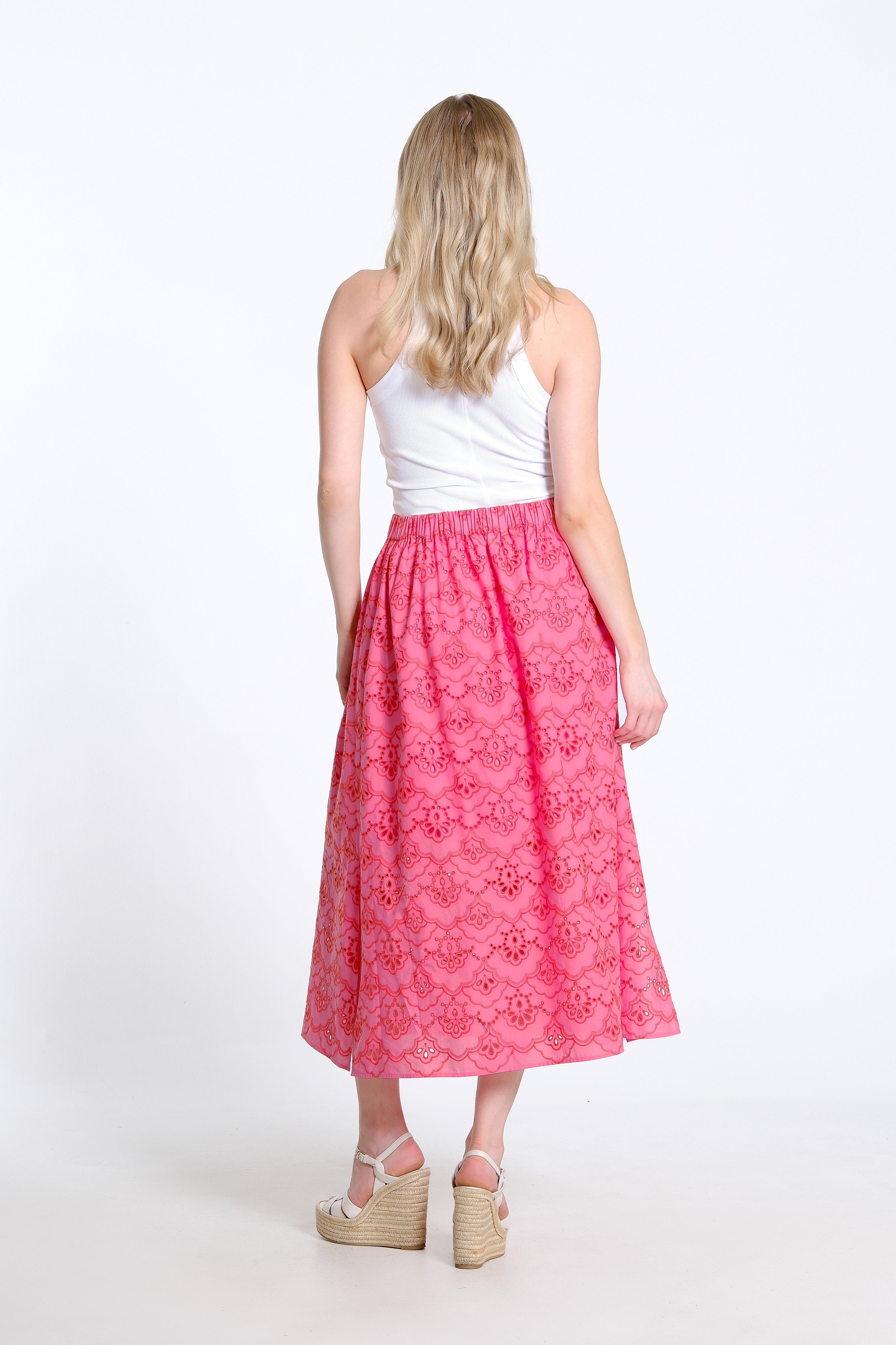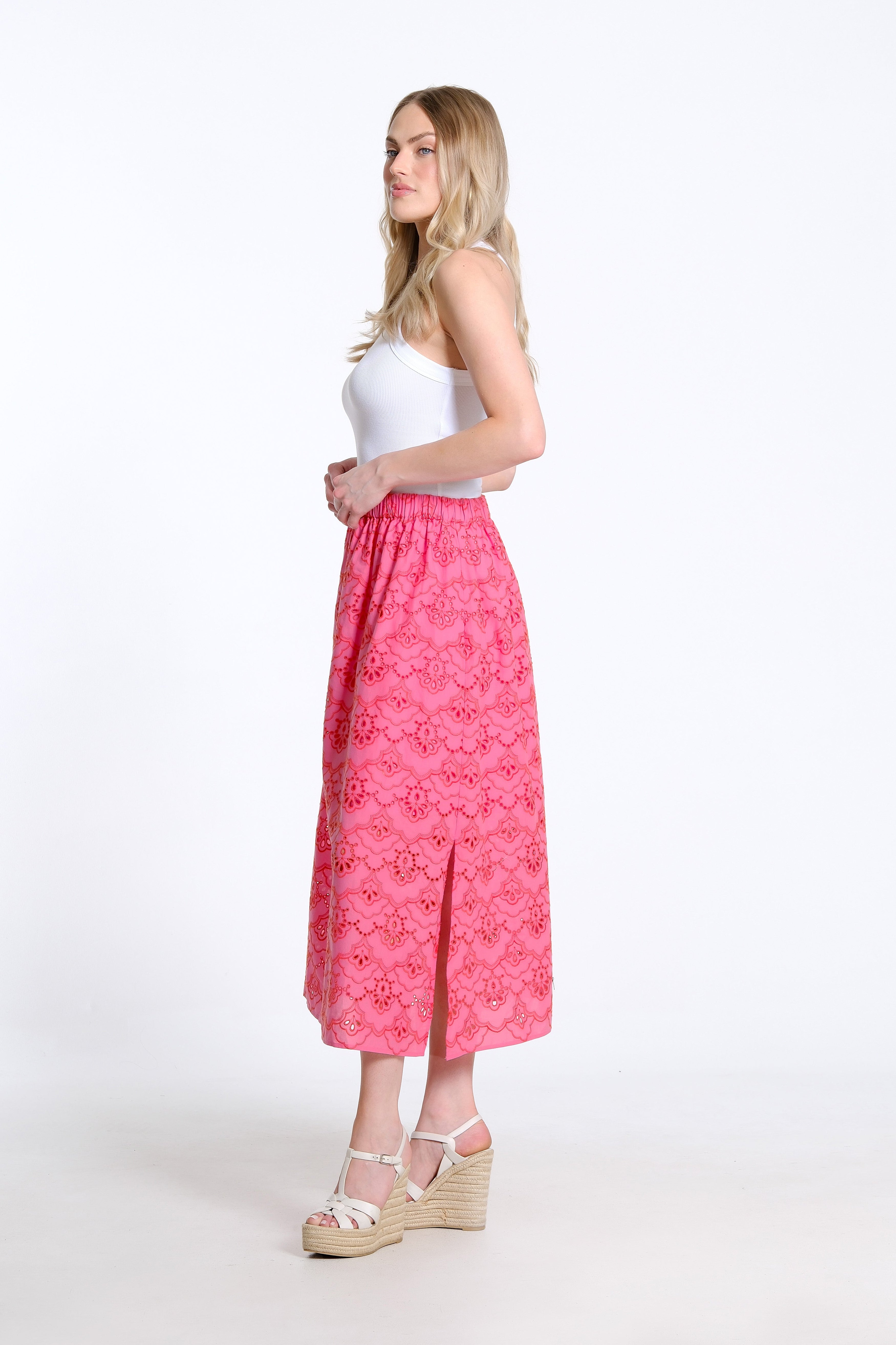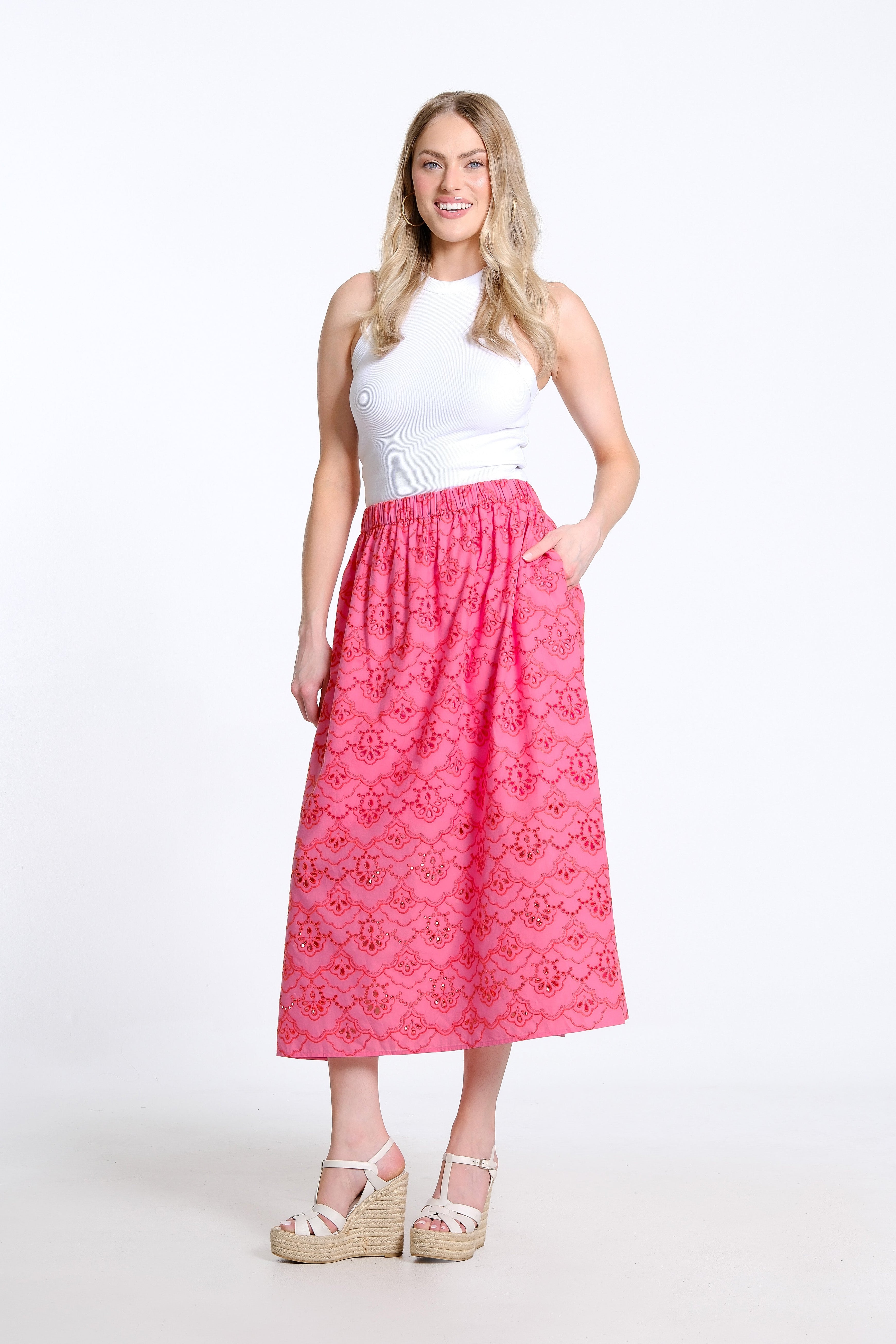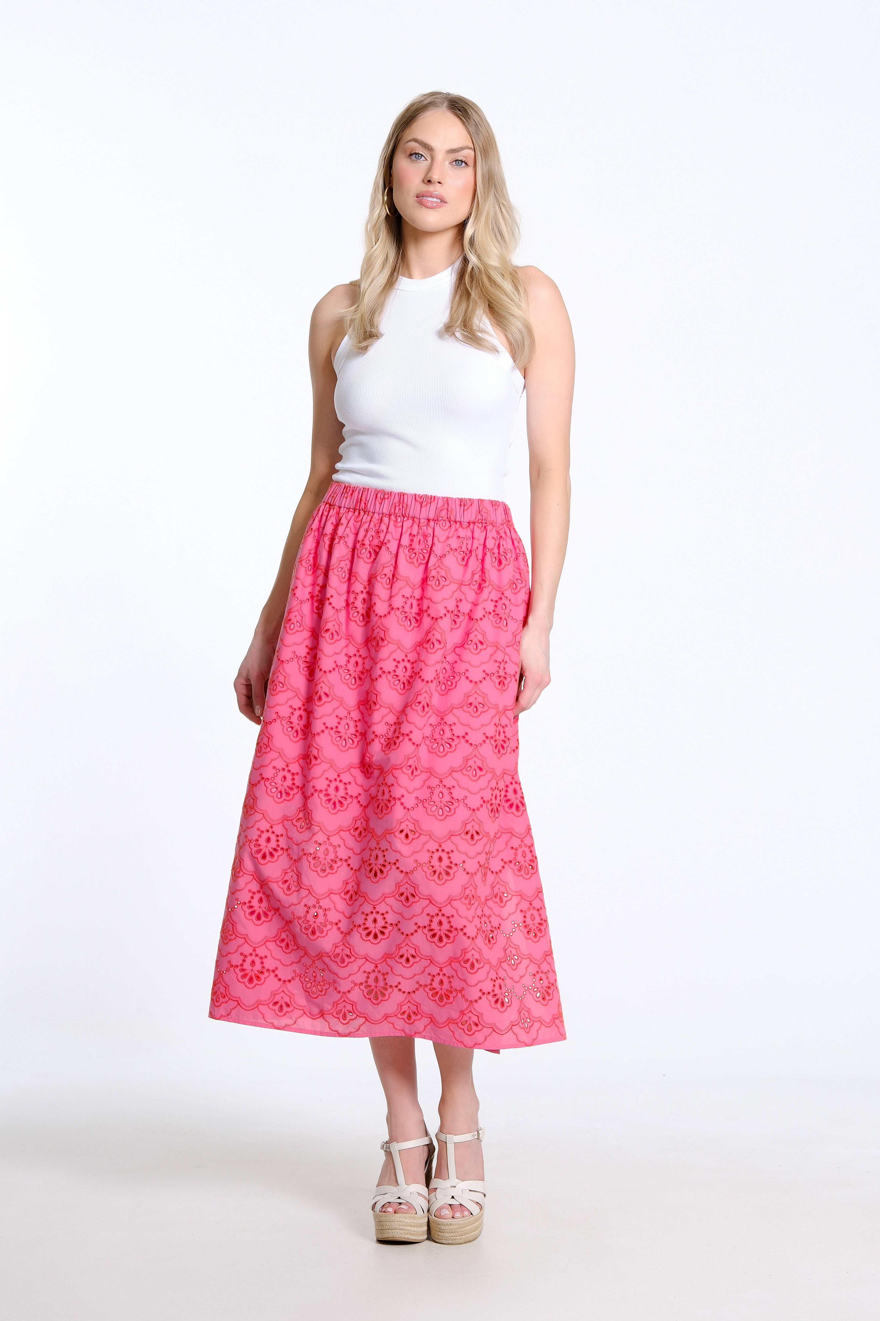 The new Paloma Skirt is an easy-to-wear flowy skirt in a feminine pink eyelet design for Resort. With her stretch waist and mid-shin length, she’s a versatile style that can be slipped over your favorite suit, and pairs perfectly with your favorite white top and sandals.