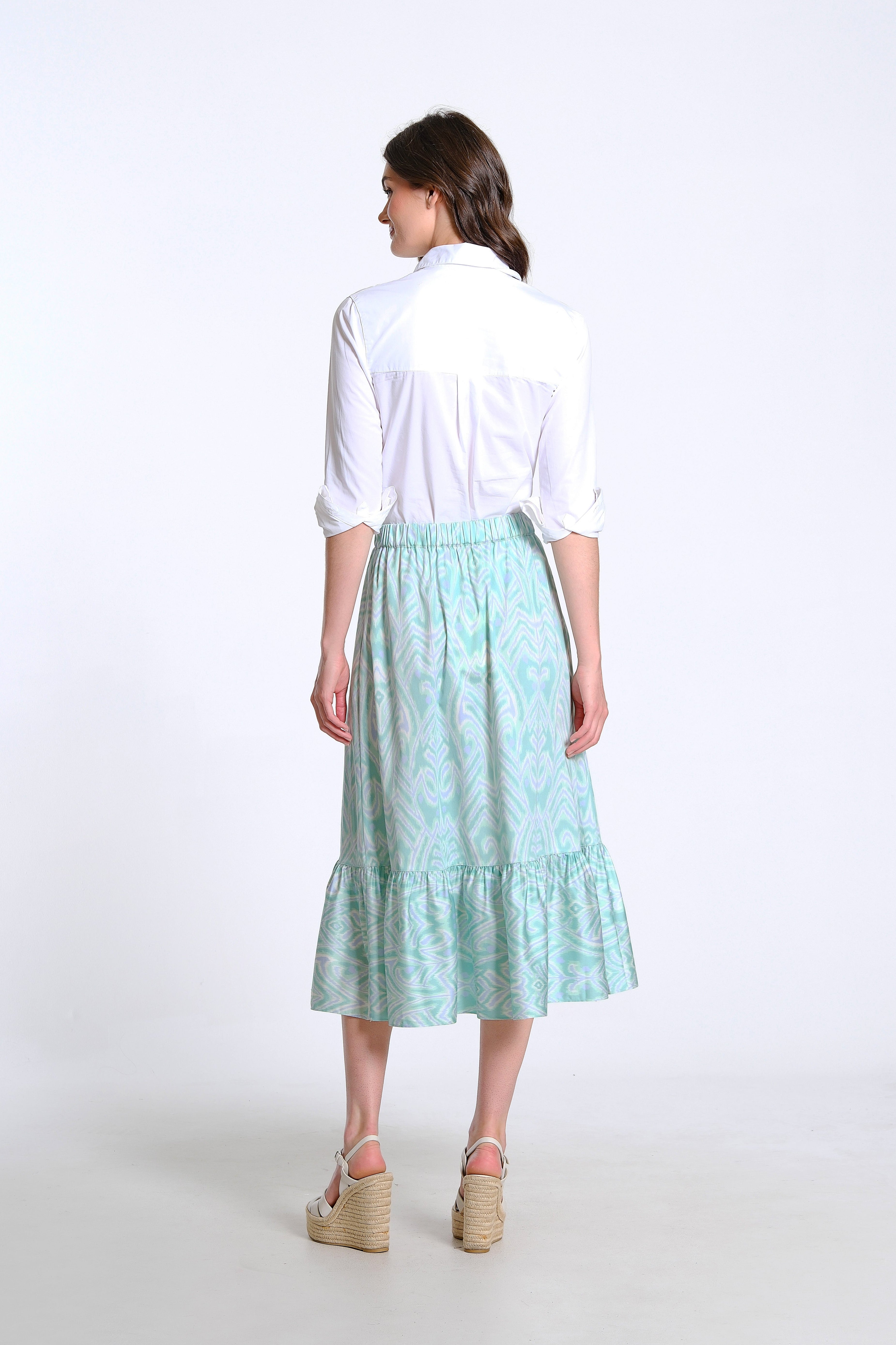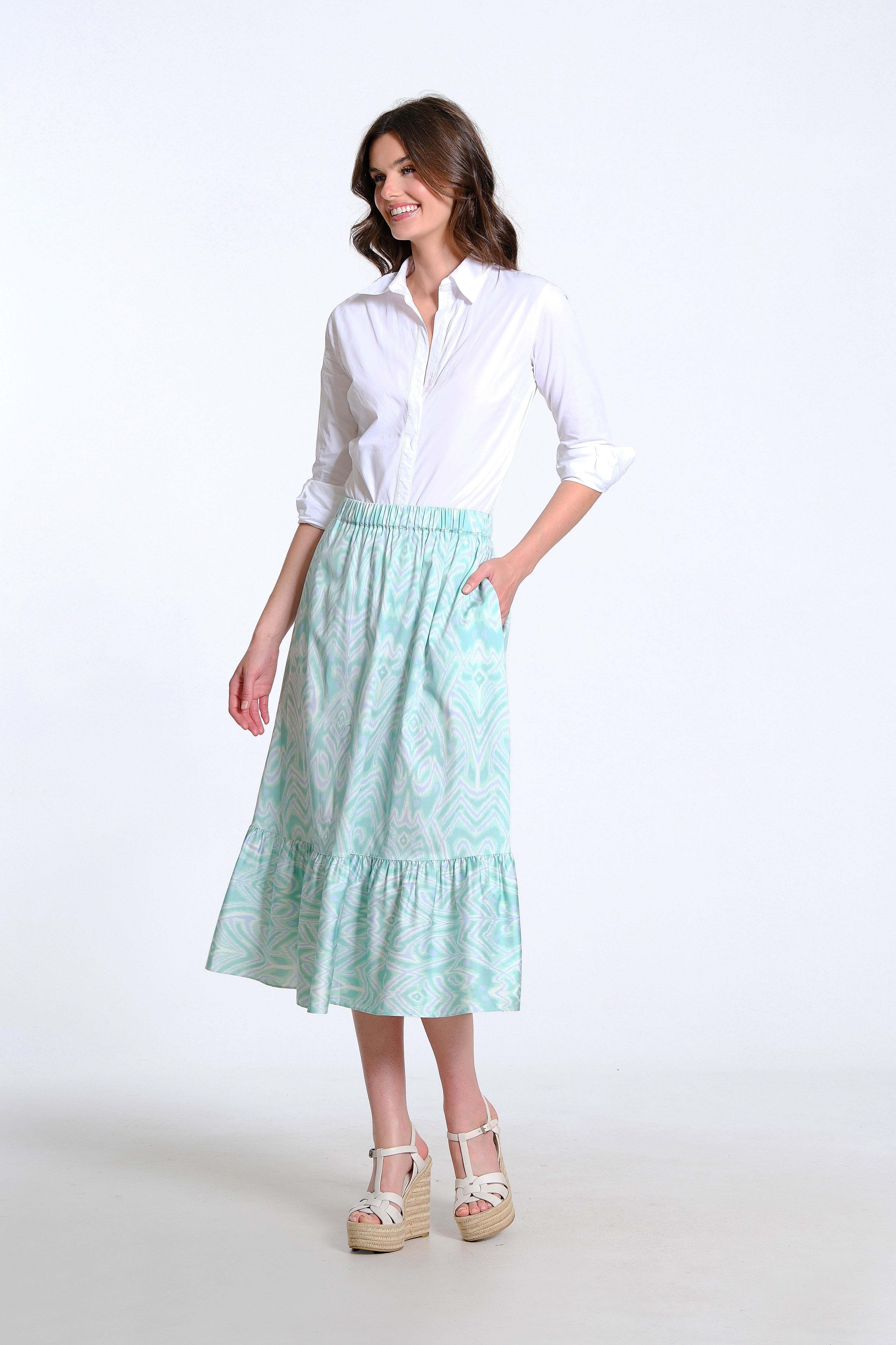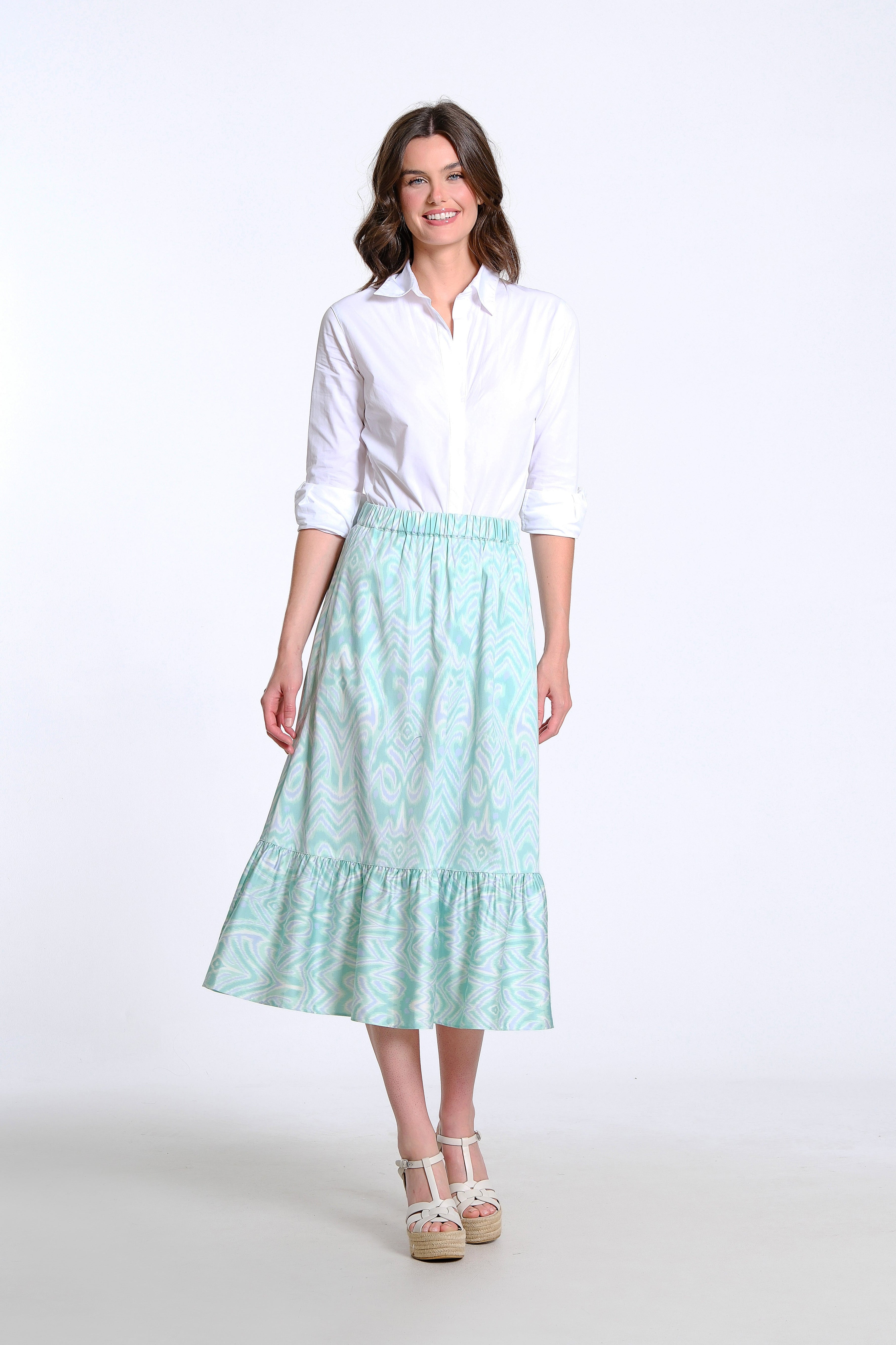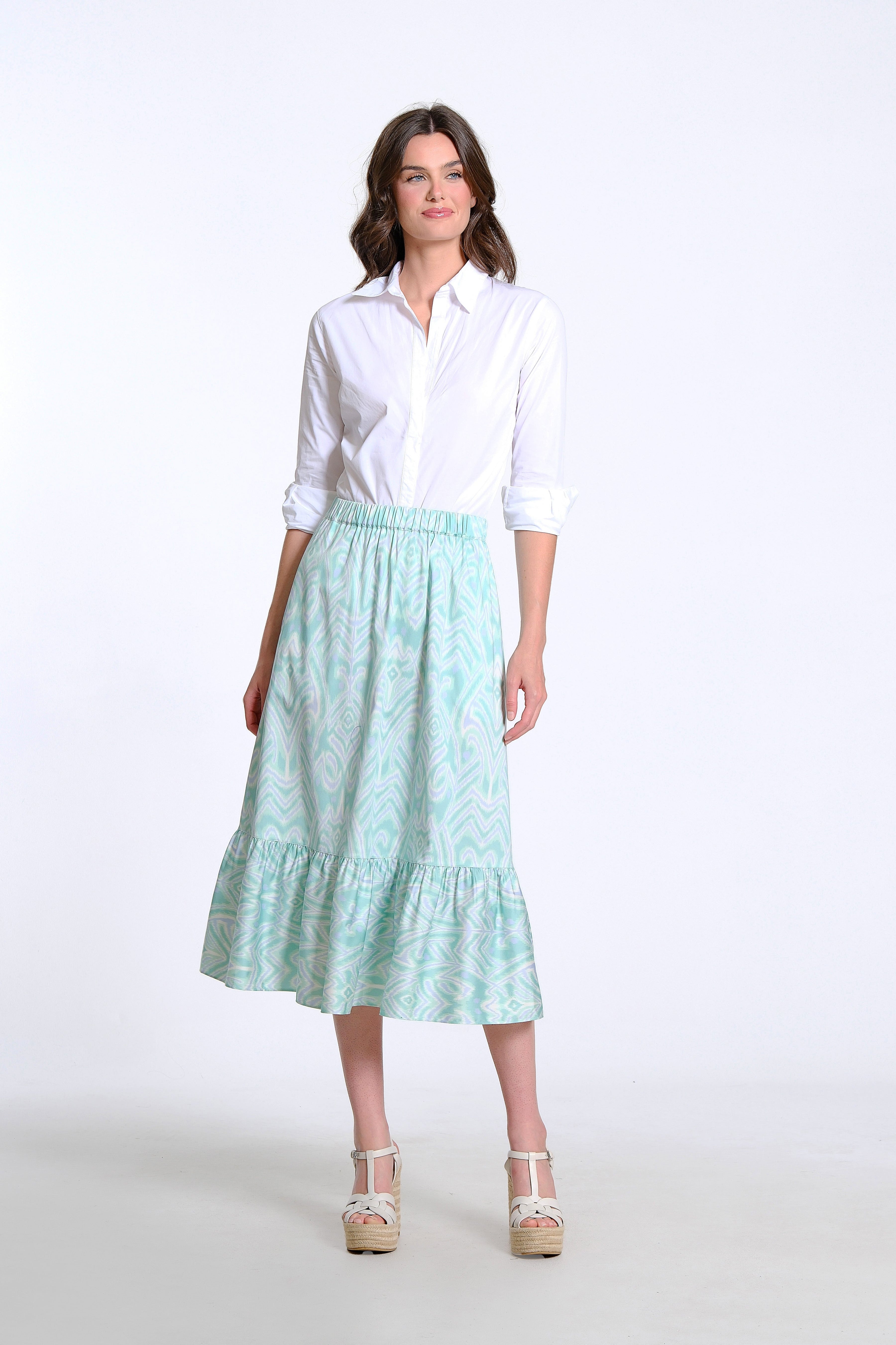 The new Vivi Skirt is an easy-to-wear light and flowy skirt in a new ikat print for Resort. With her stretch waist and mid-shin length, she’s a versatile style that can be dressed up with wedges or down with sandals.