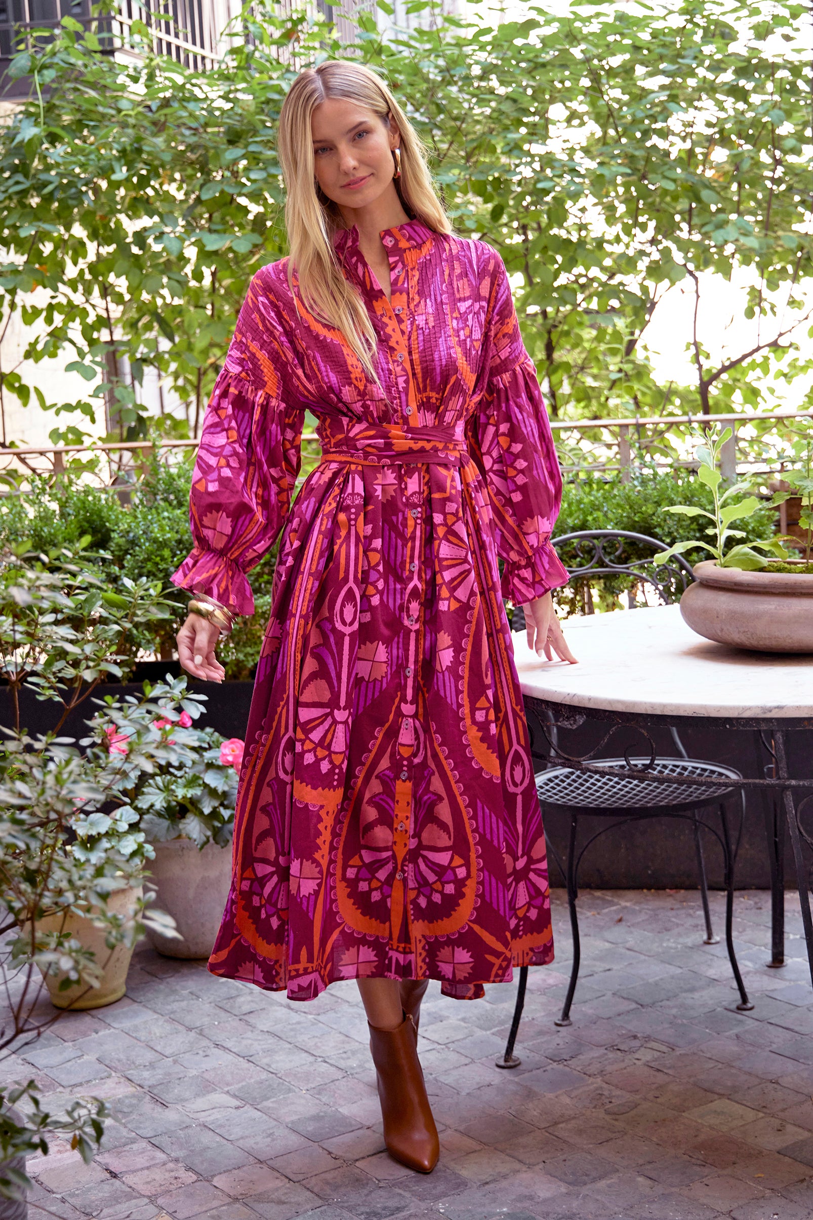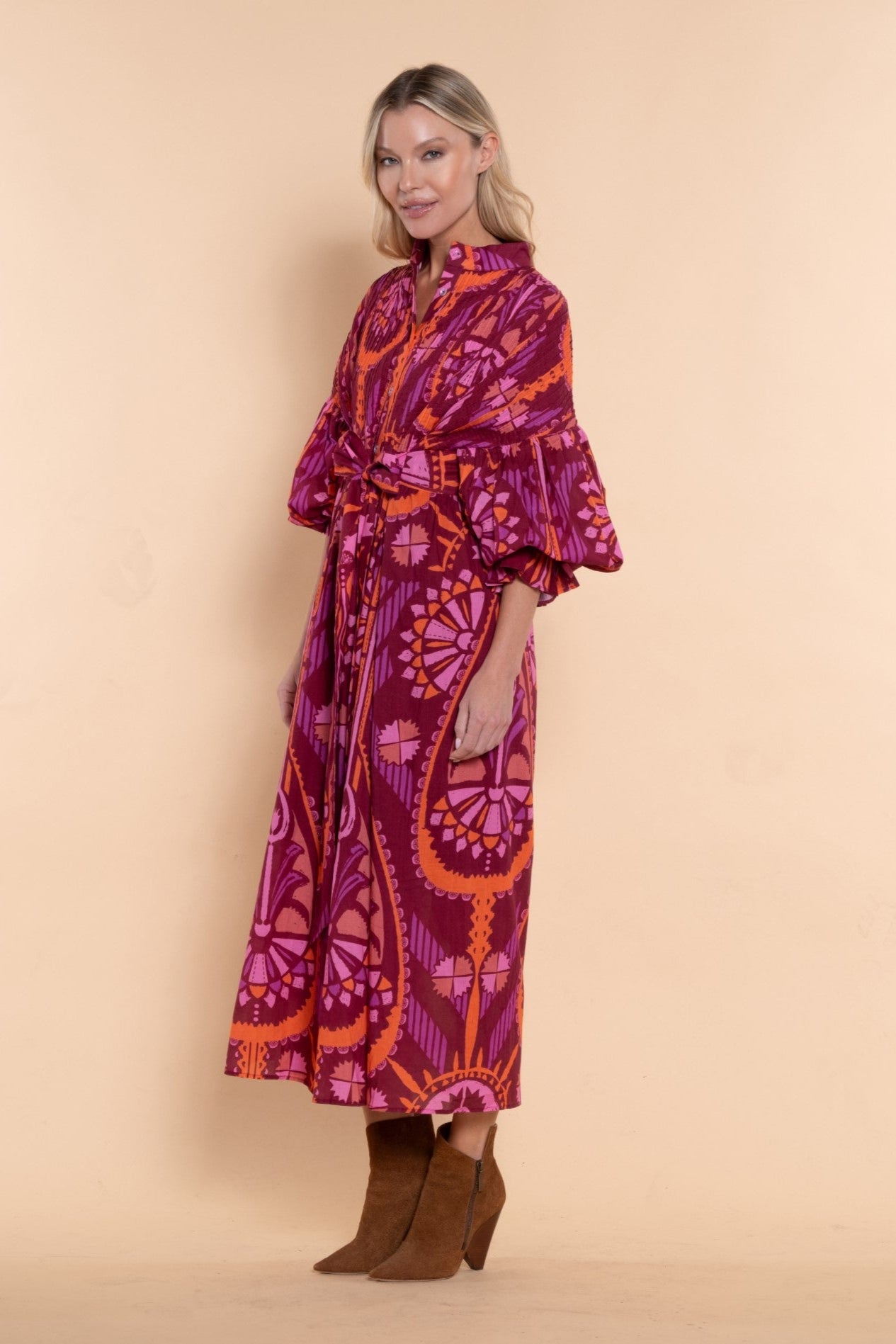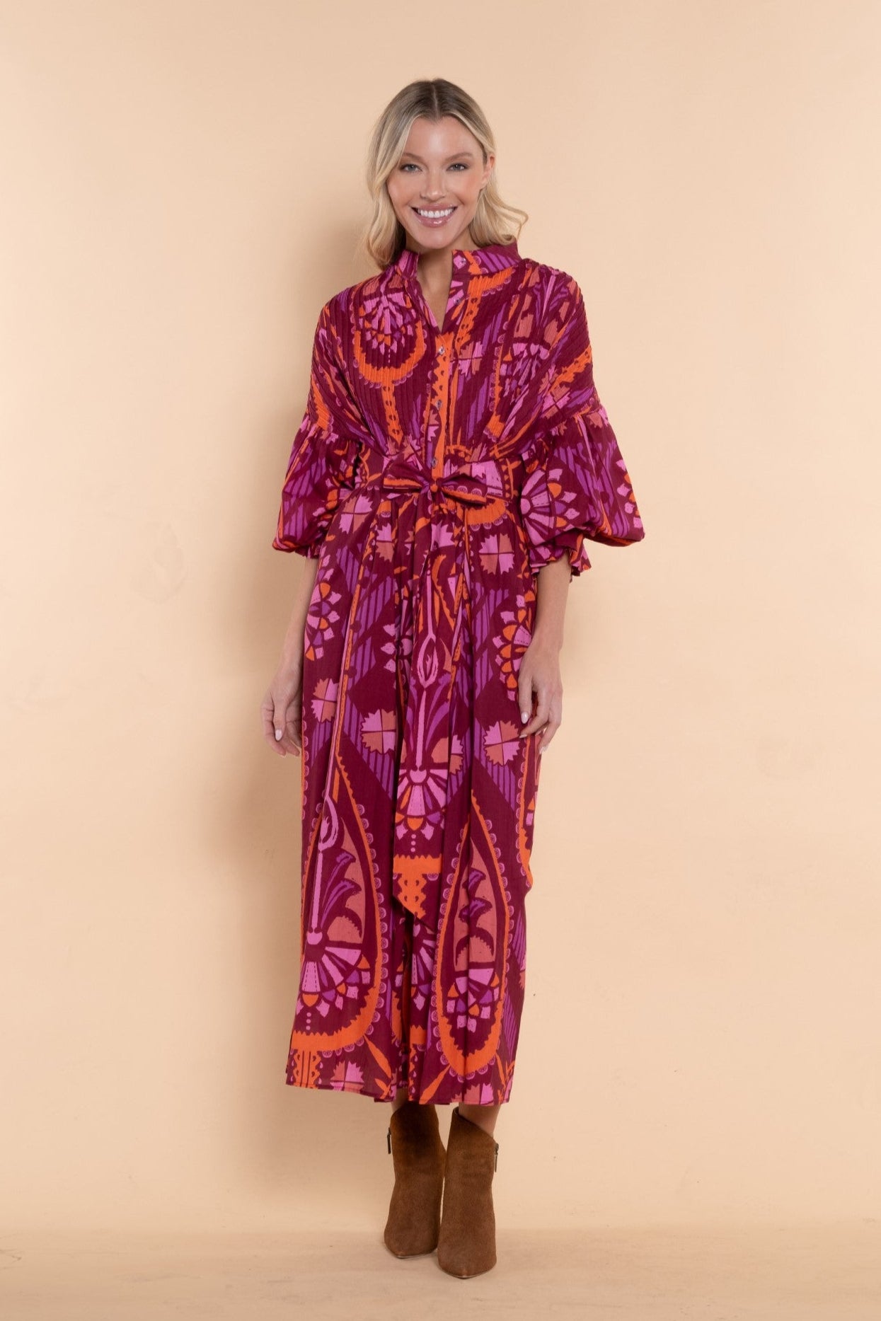 Every body is beautiful. Introducing The Every Body Dress, the perfect addition to your wardrobe. Designed as an innovative one size fits most style, making it perfect for a broad variety of body types, this dress offers effortless appeal and comfort. Made from light and airy cotton voile, it features a full gathered sleeve, button front, an attached, adjustable belt and a flowy skirt for a chic and sophisticated look. Elevate your style with this elegant and comfortable wardrobe addition.