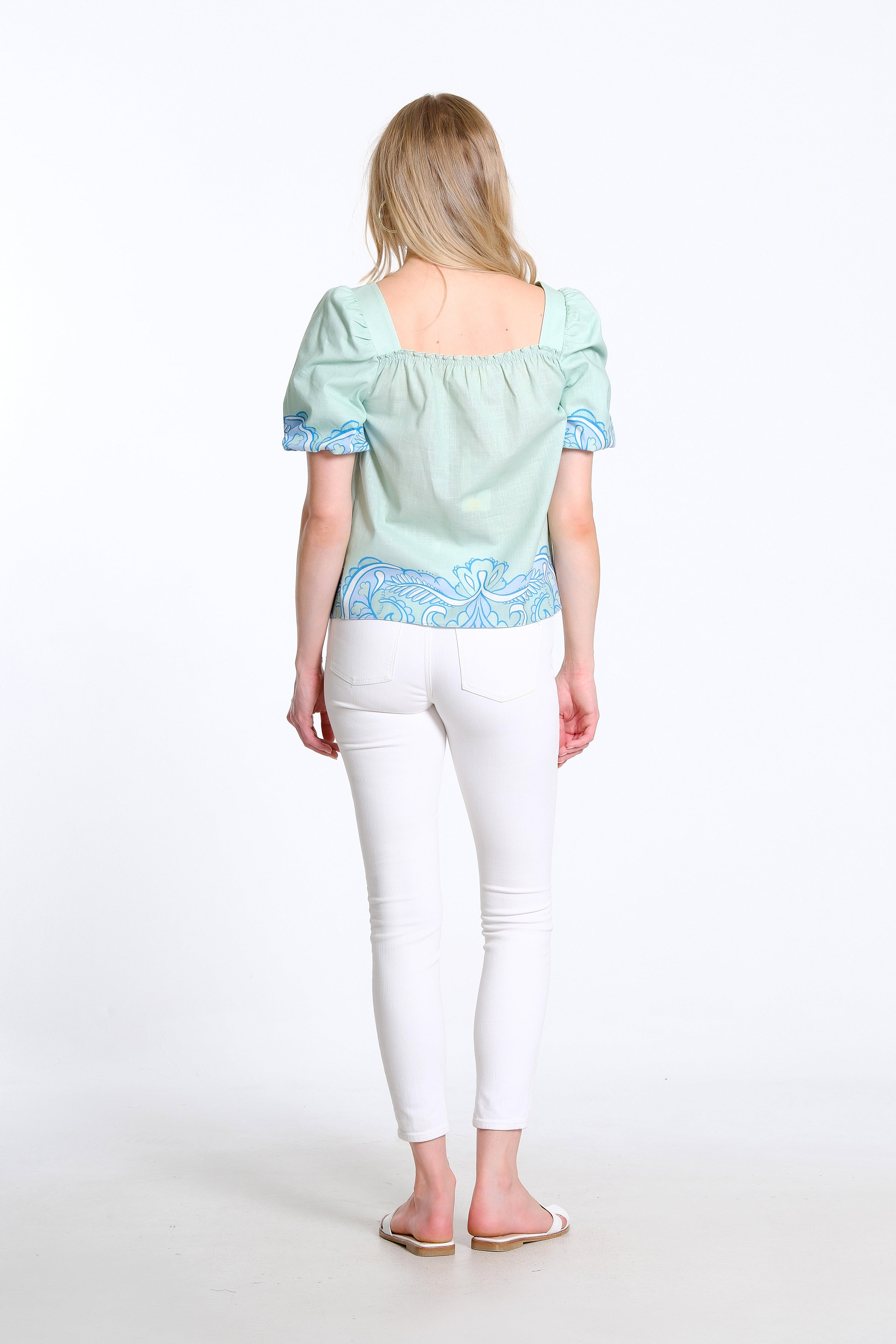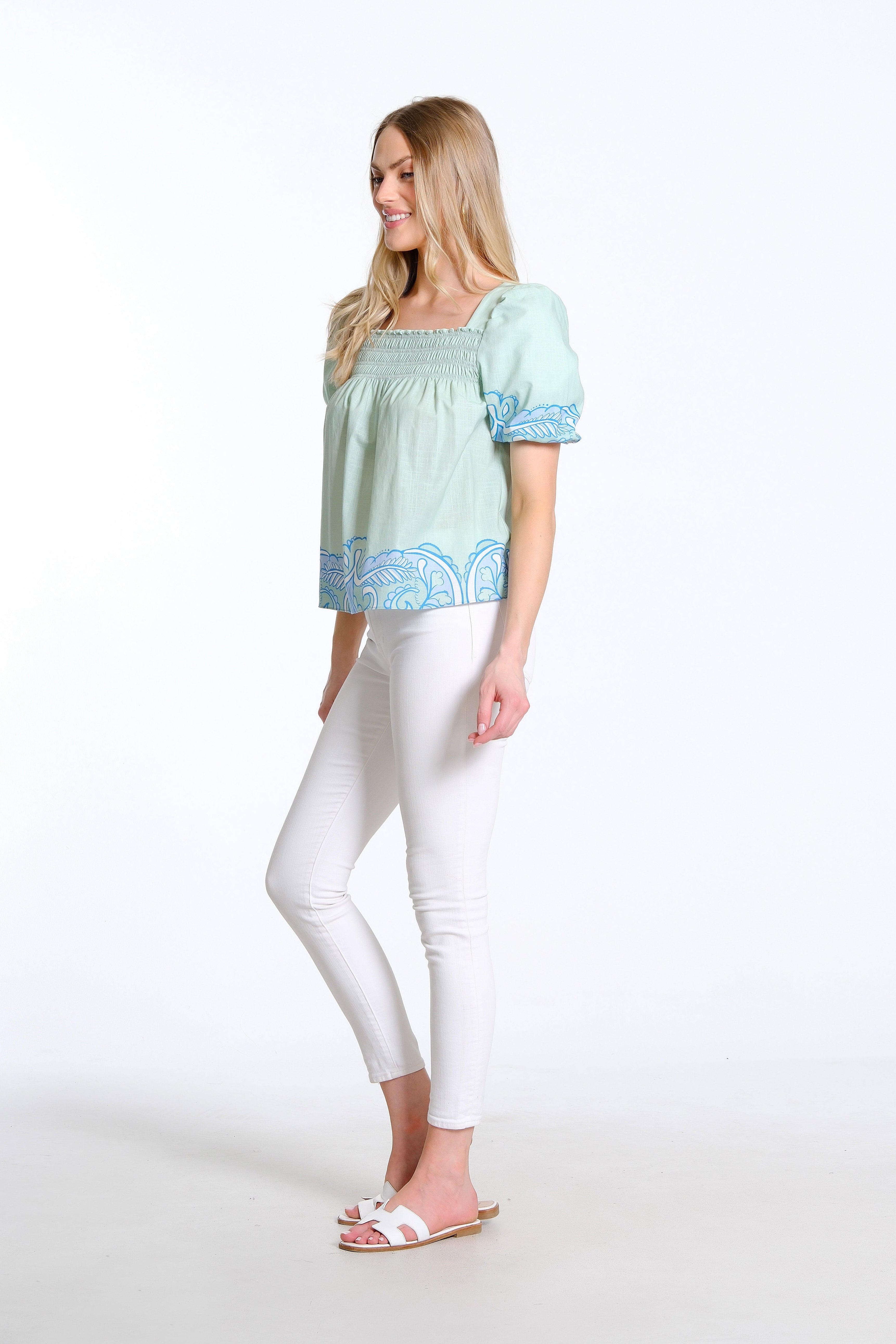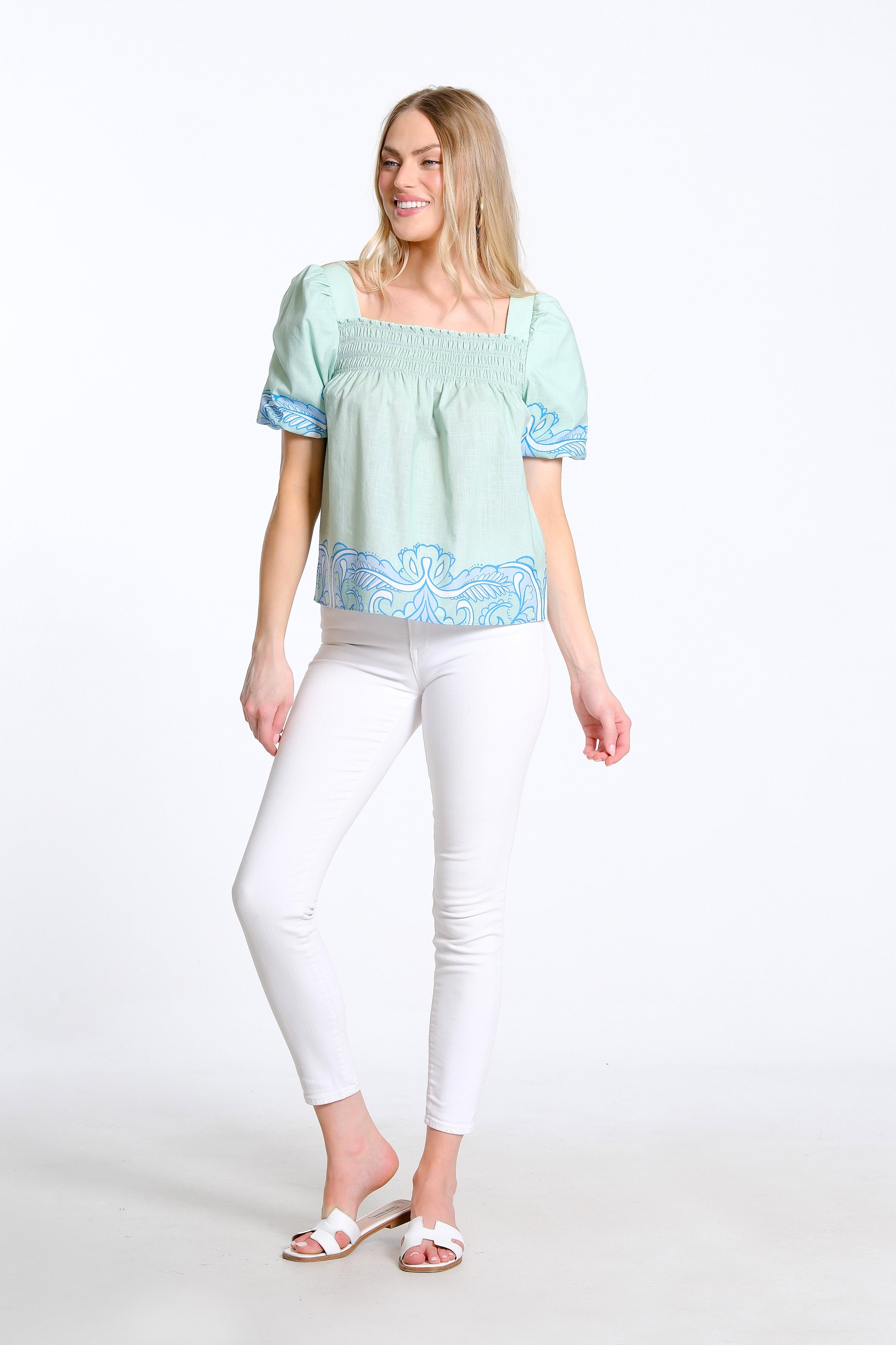 The Louisa Blouse is the perfect getaway top with a delicately smocked square neckline and easy-to-wear flowy figure. Featuring a pale seafoam color and whimsical damask print, she pairs perfectly with denim or the matching Quinn Pant.