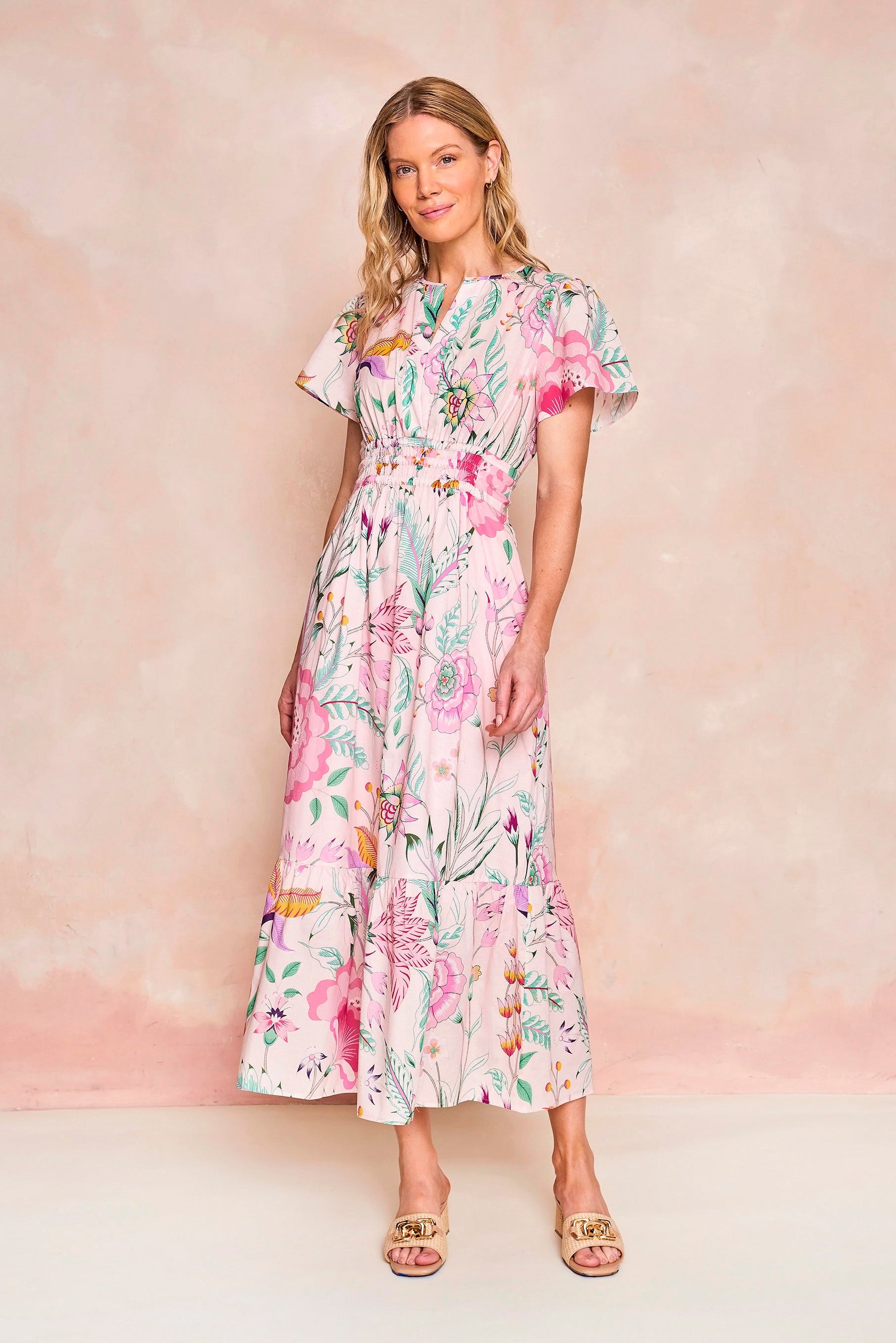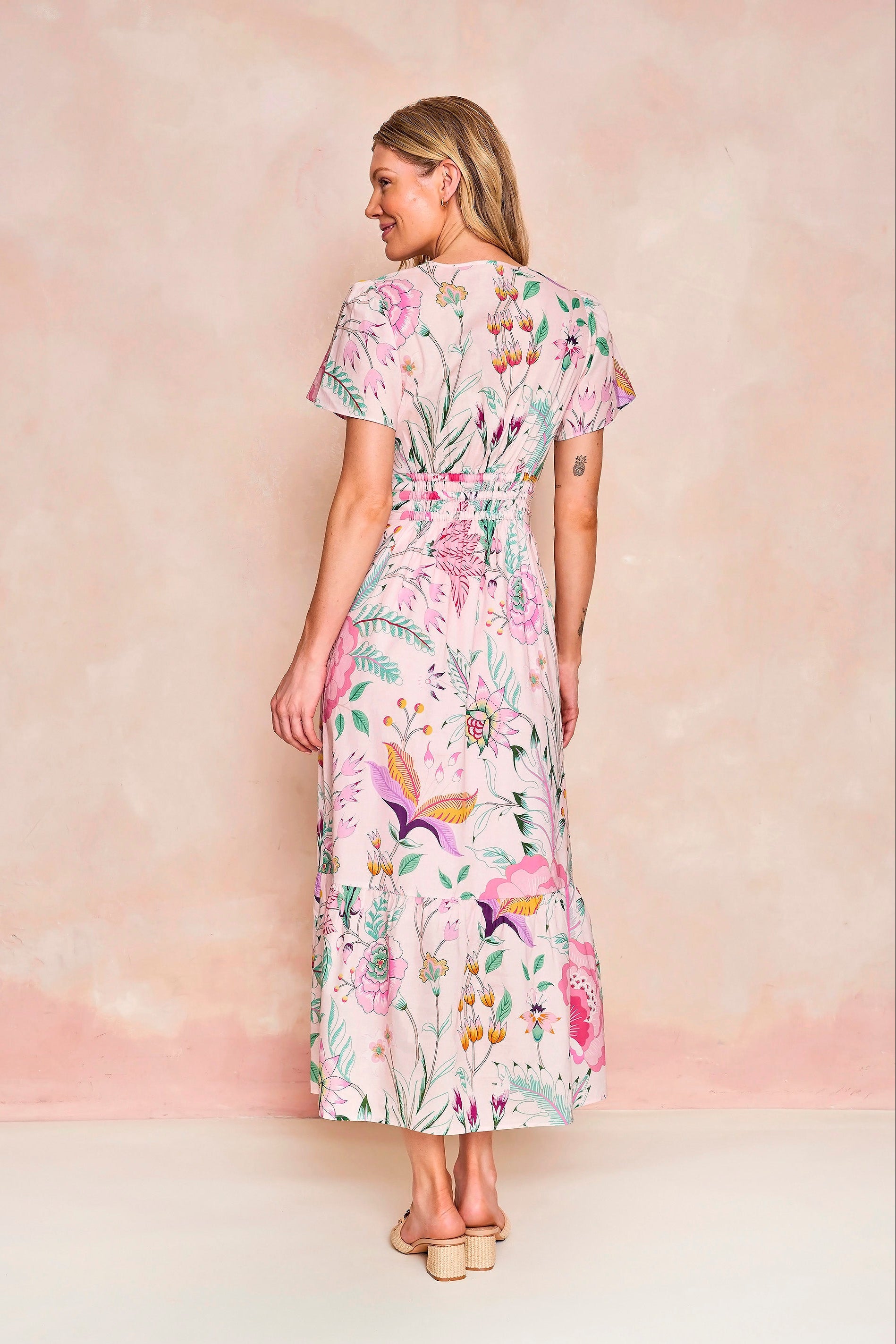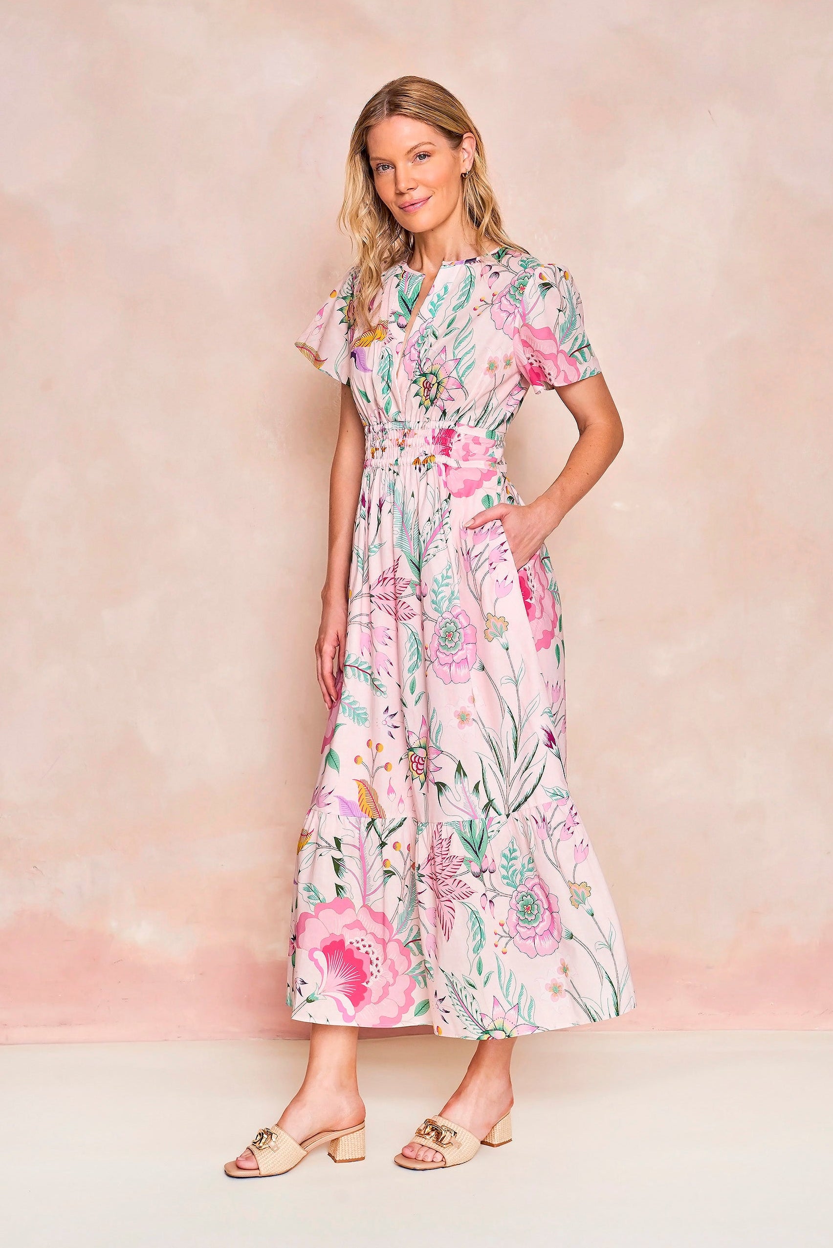 Our best-selling Eloise Dress, with her flattering ruched waist and ankle-skimming length, is now in a pink feminine floral pattern for spring. A favorite for all body types and sizes, she’s easily dressed up or down and is a must-have closet staple