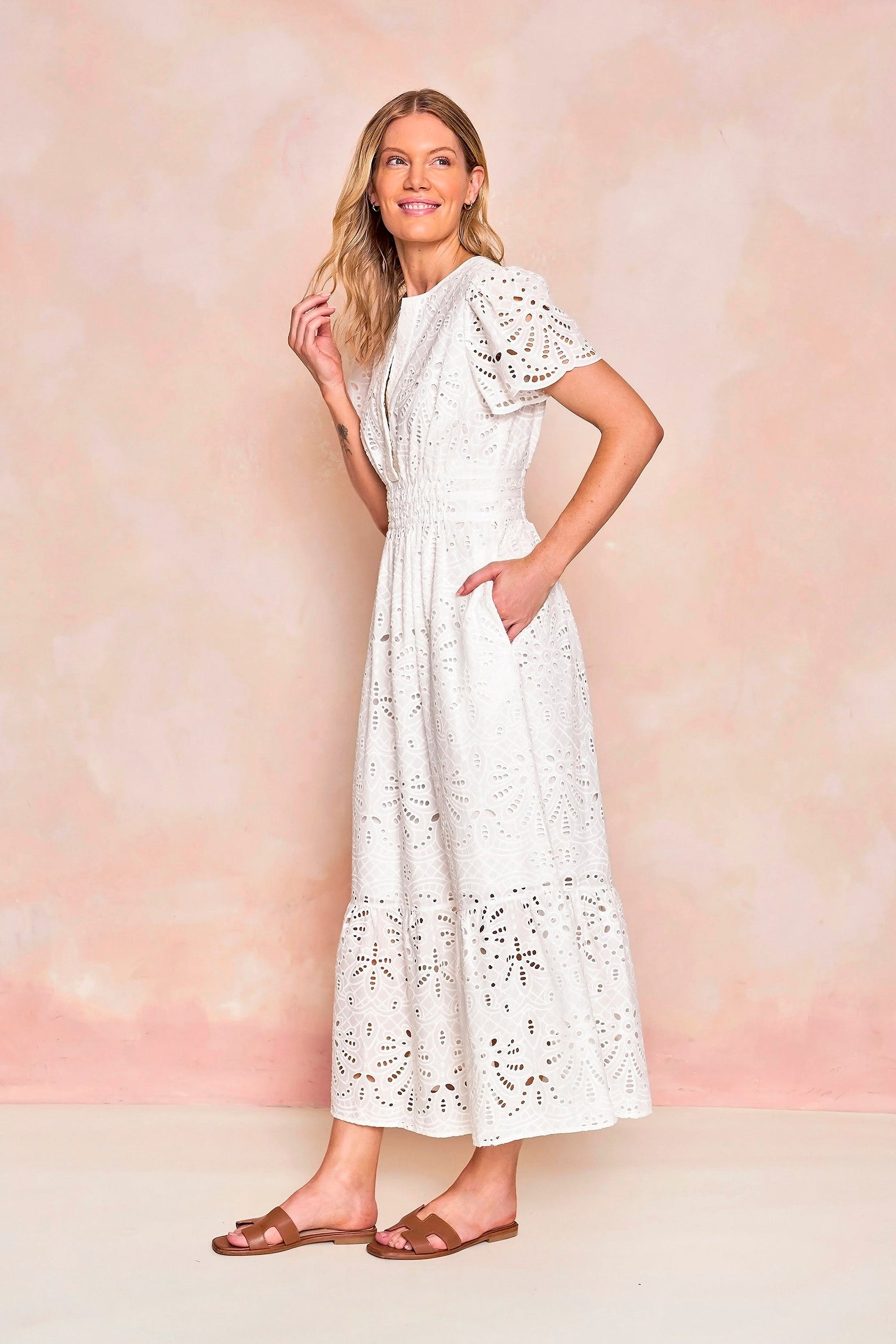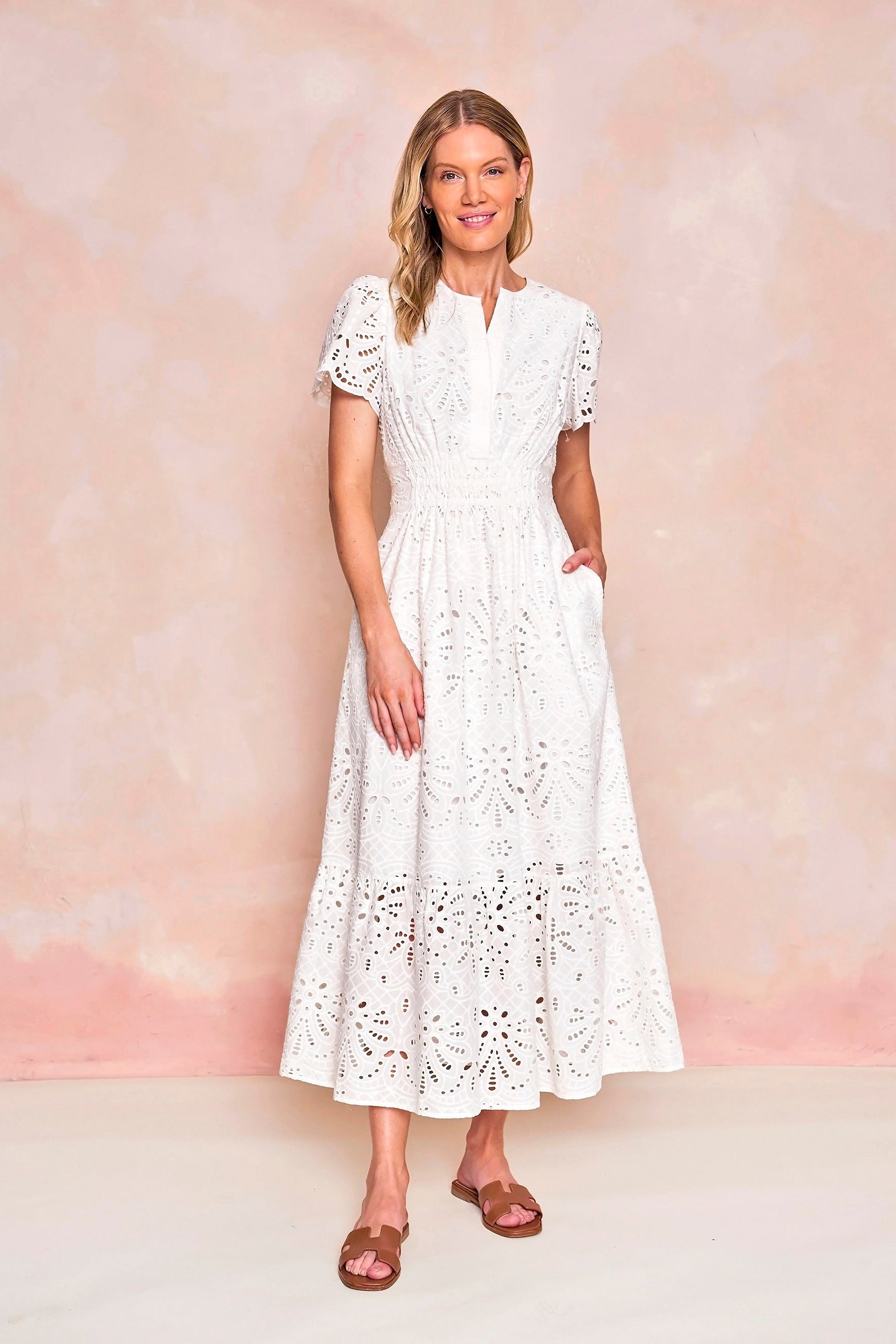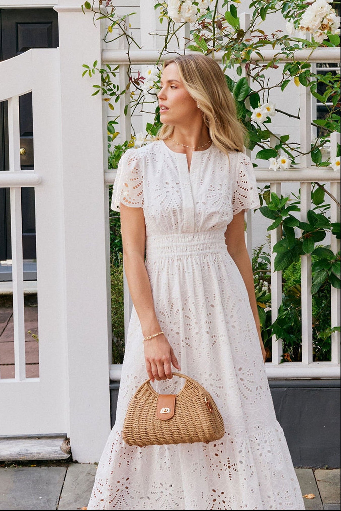 Our best-selling Eloise Dress, with her flattering ruched waist and ankle-skimming length, is now in an intricate white eyelet pattern for spring. A favorite for all body types and sizes, she’s easily dressed up or down and is a must-have closet staple.