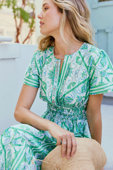 Our best-selling Eloise Dress, with her flattering ruched waist and ankle-skimming length, is here in our new green and blue tile pattern for spring. A favorite for all body types and sizes, she’s easily dressed up or down and is a must-have closet staple.