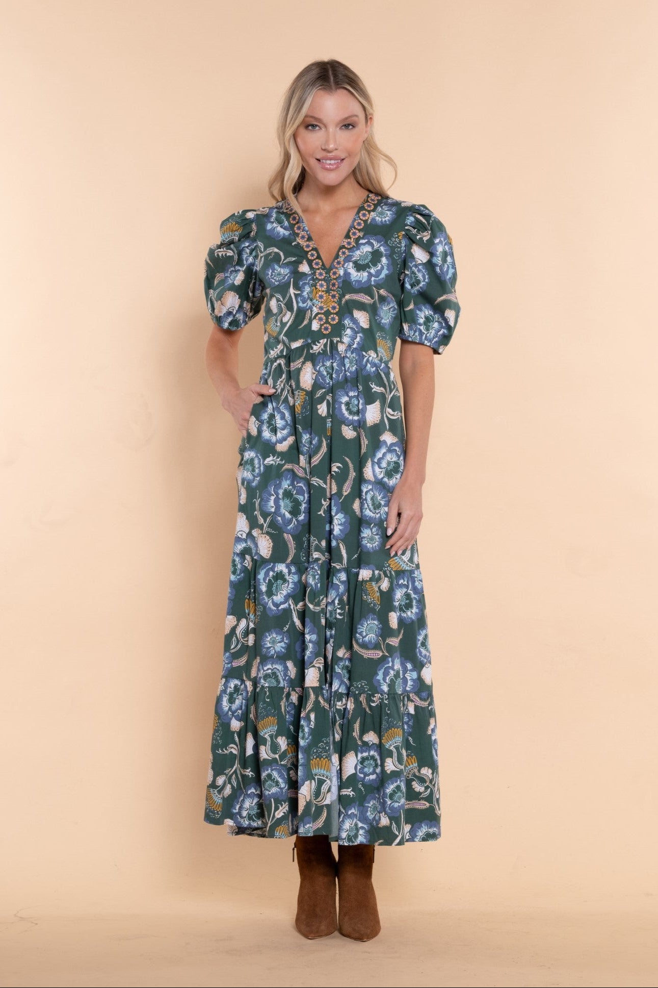 Elevate your wardrobe with the Margot Dress, a captivating silhouette that blends timeless elegance with contemporary style. Its voluminous sleeves, embellished v-neckline, and flattering slit make it ideal for any and every occasion. Crafted from cotton lycra, this dress guarantees all-day comfort while making a bold statement with every step.