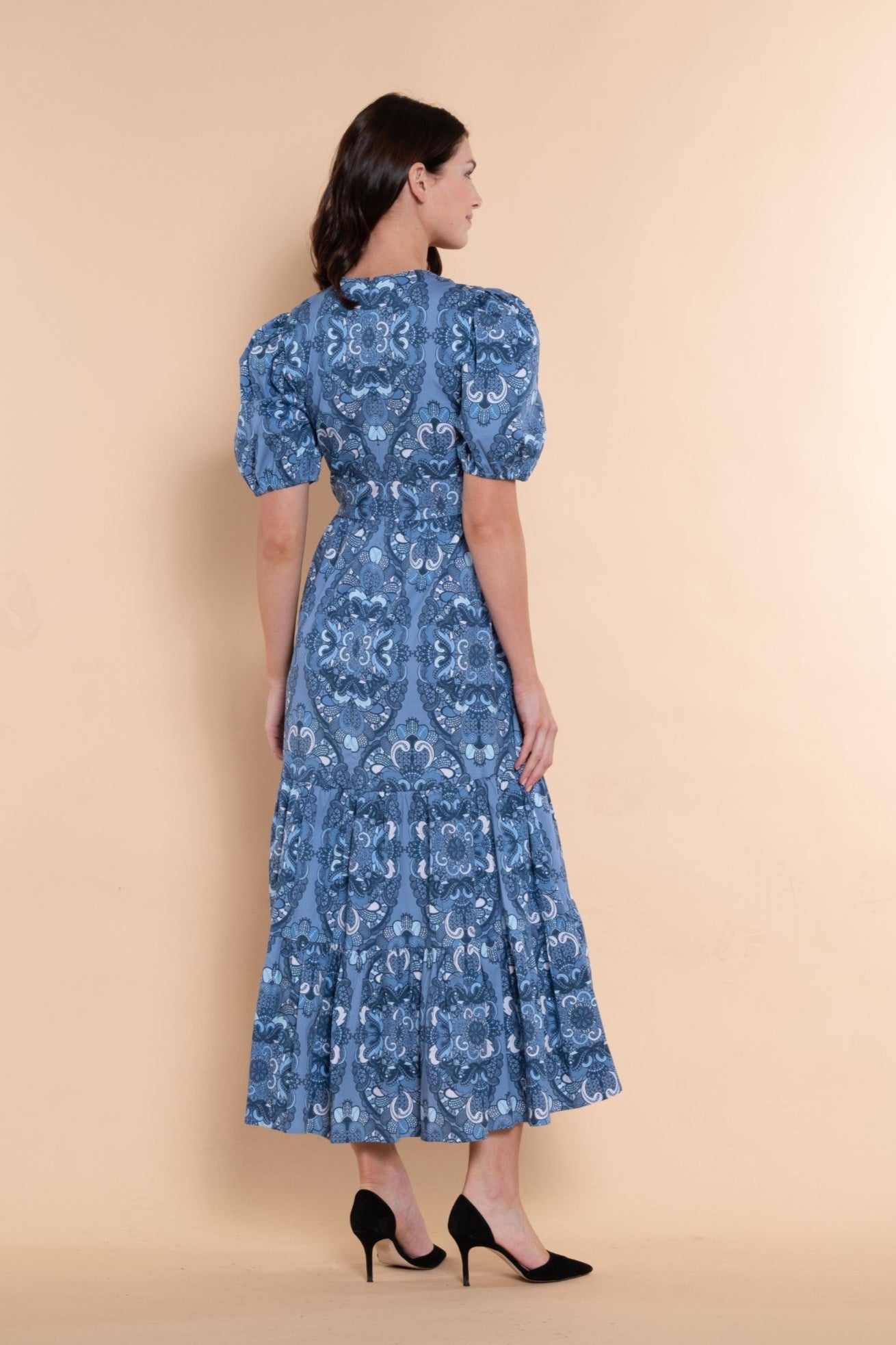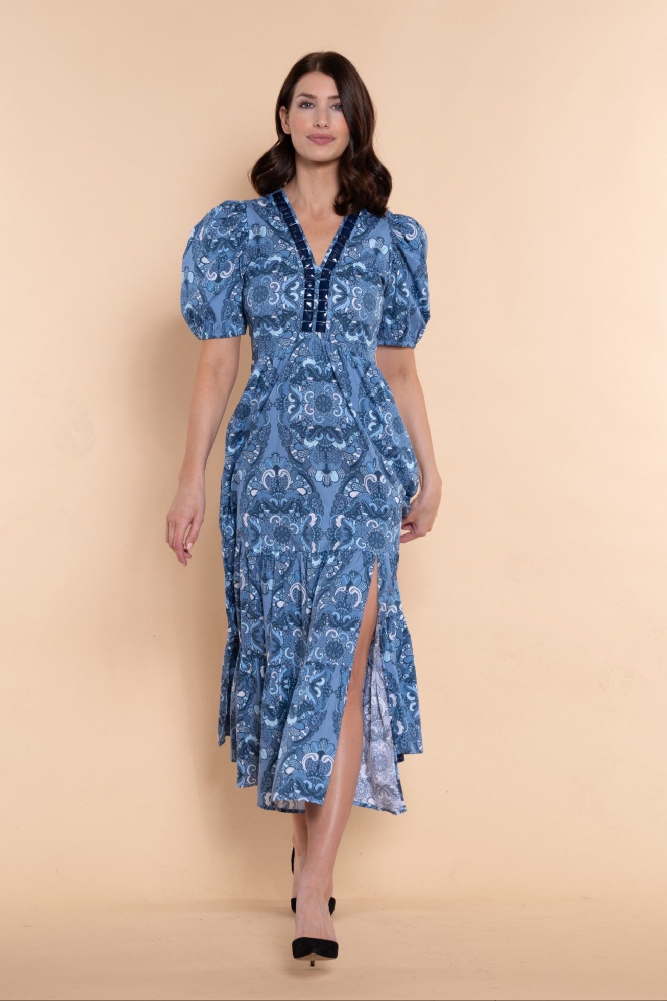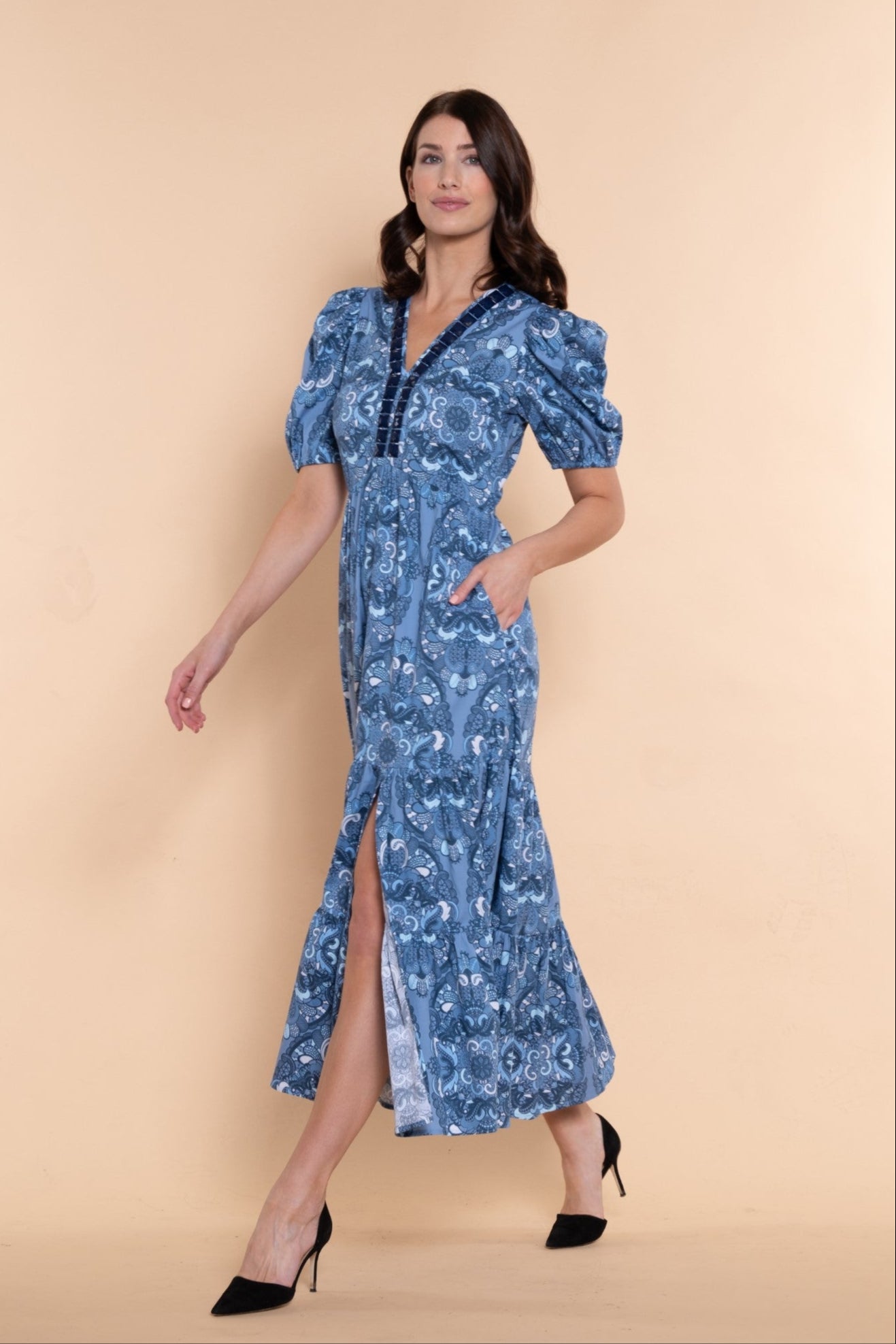 Elevate your wardrobe with the Margot Dress, a captivating silhouette that blends timeless elegance with contemporary style. Its voluminous sleeves, embellished v-neckline, and flattering slit make it ideal for any and every occasion. Crafted from cotton lycra, this dress guarantees all-day comfort while making a bold statement with every step.