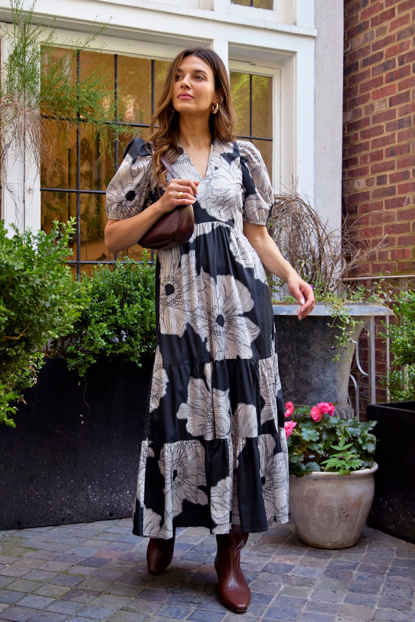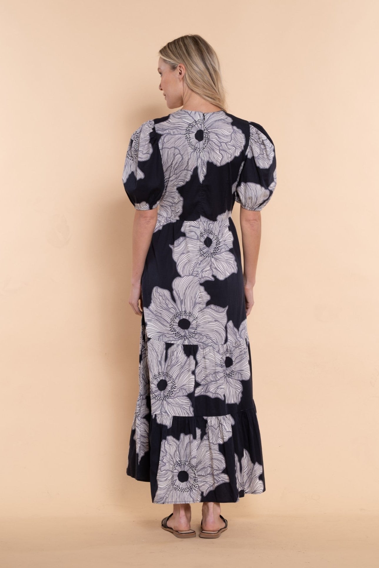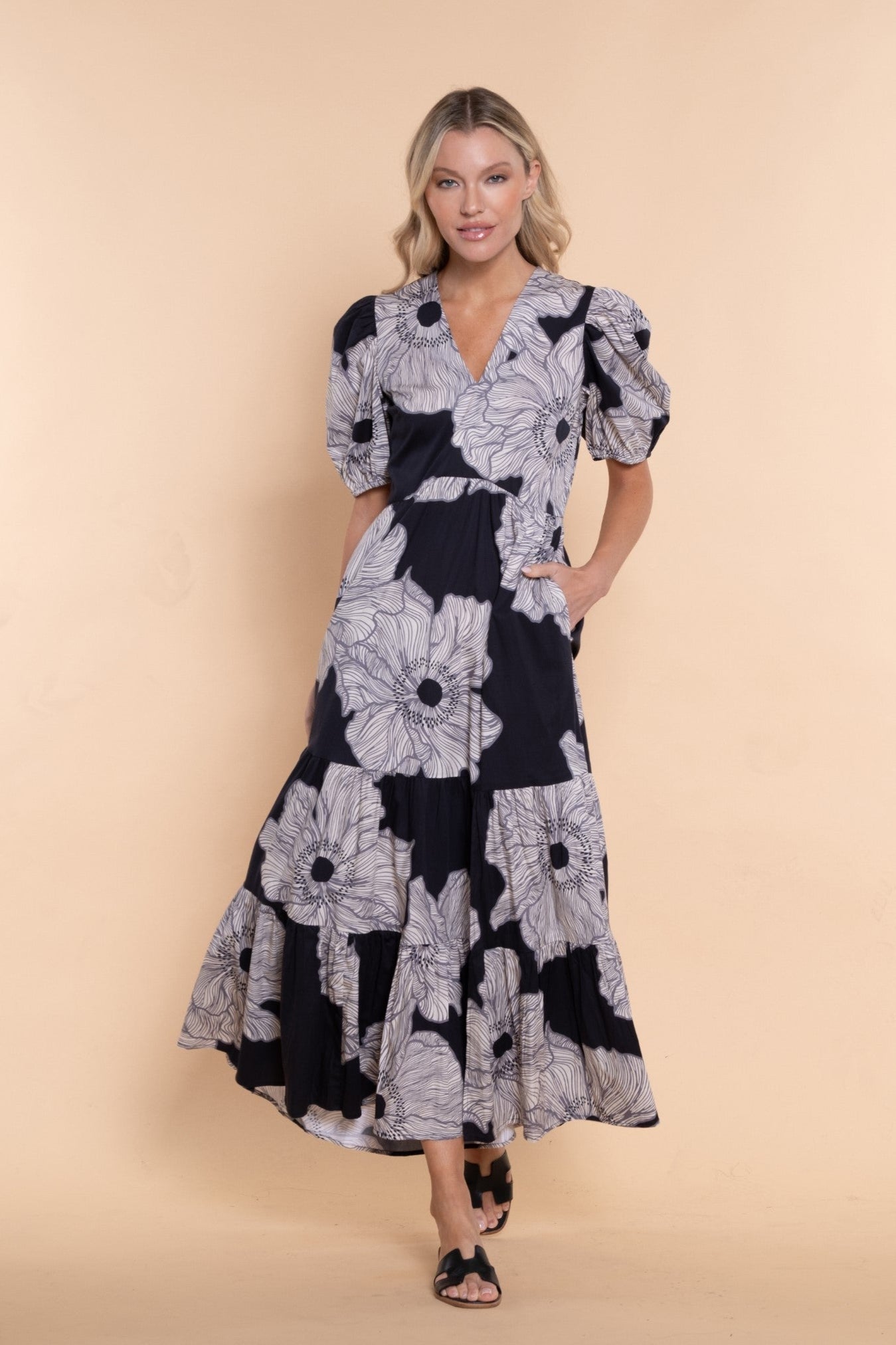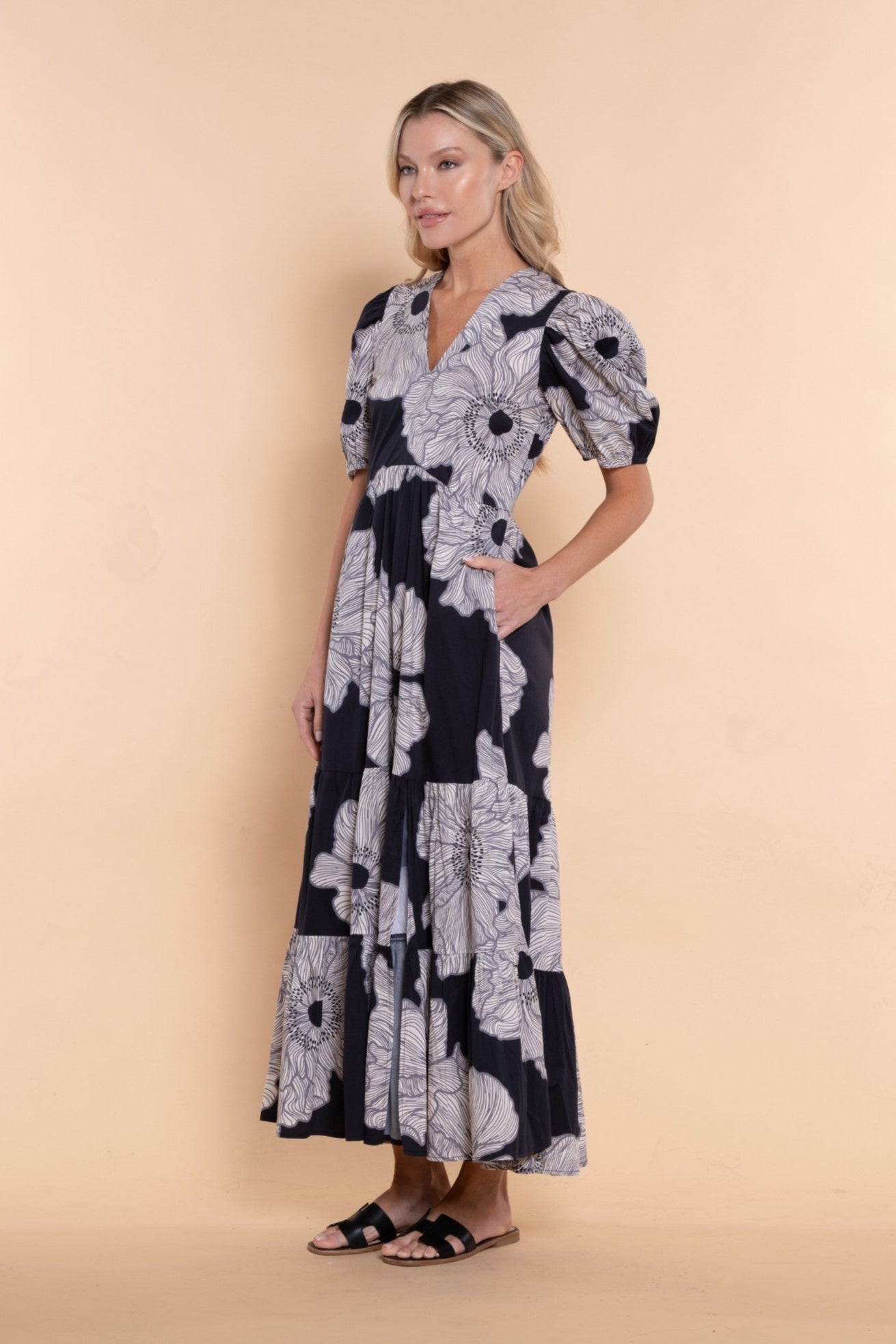 Elevate your wardrobe with the Margot Dress in Midnight Poppy, a captivating silhouette that blends timeless elegance with contemporary style. Its voluminous sleeves, v-neckline, and flattering slit make it ideal for any occasion. Crafted from cotton lycra, this dress guarantees all-day comfort while making a bold statement with every step.